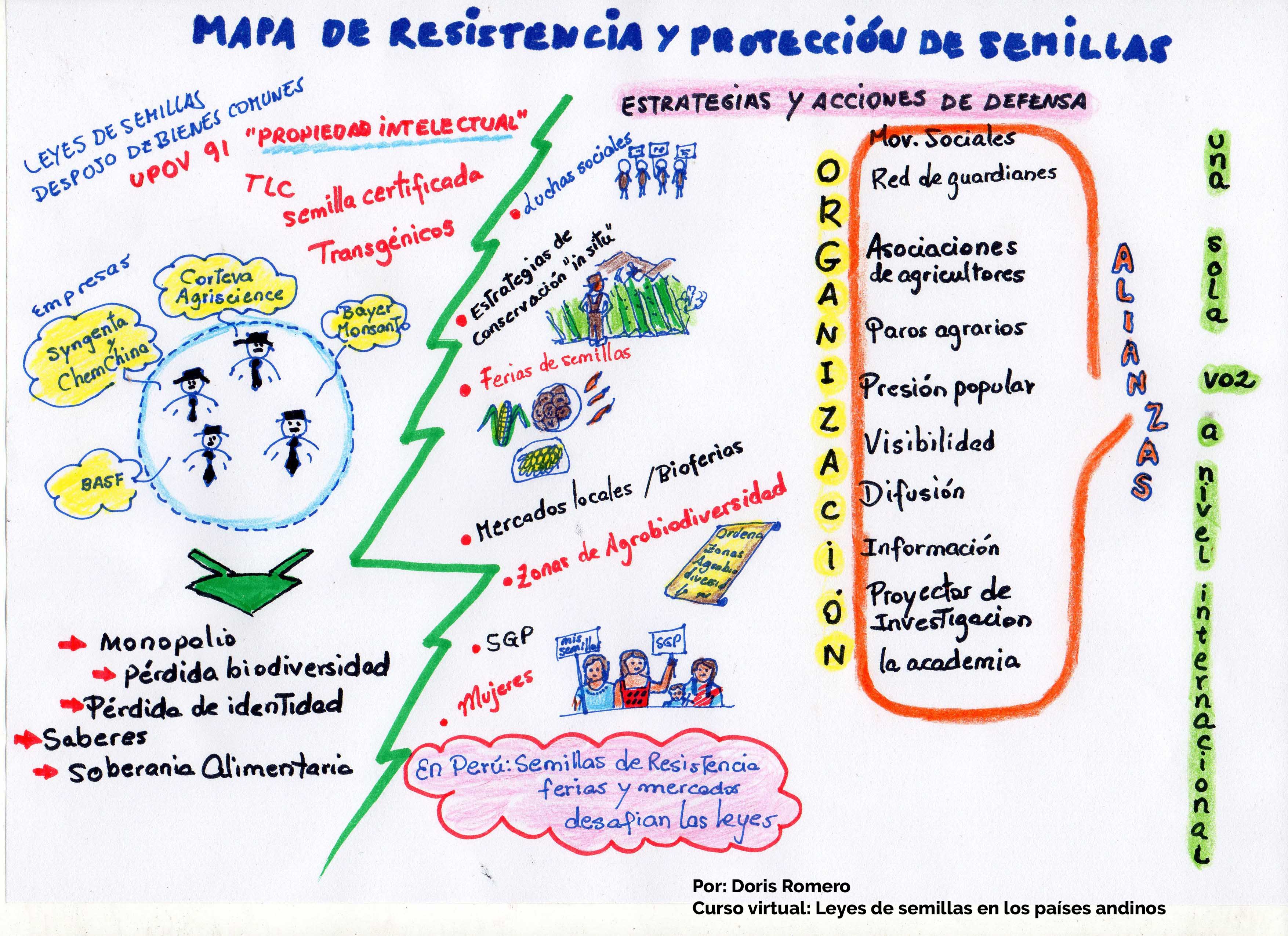 La resistencia social manifestada a través de acciones como presión popular en contra de las leyes de semillas es vital. Acciones como las estrategias de conservación in situ de semillas, las ferias de semillas nativas, mercados locales y organizaciones de agricultores hacen posible los cambios. Es necesario, entonces, la construcción de alianzas para tener mayor fuerza y esto se logrará cuando la población en su conjunto, es decir nosotros los consumidores, hagamos conciencia de la importancia de las semillas como origen de vida y no seamos ajenos a la lucha de las organizaciones de agricultores, indígenas y familias campesinas, etc. La difusión de información es sumamente necesaria para lograr mayor fuerza en la defensa y protección de nuestras semillas como bienes comunes.” (Doris Romero)