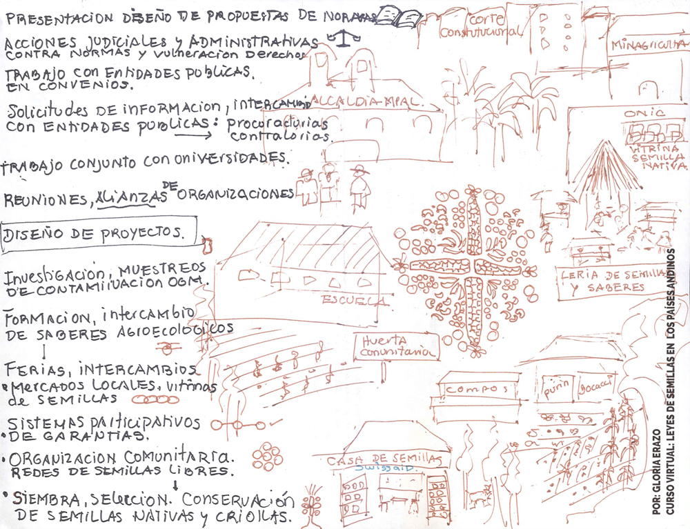 En el mundo existen dos herramientas para desposesión de las semillas; el control tecnológico de las semillas y los mecanismos legales. De acuerdo a Elizabeth Bravo, 6 empresas controlan el 70% del comercio mundial de las semillas y avanzan en su protección jurídica internacional a través de los derechos de propiedad intelectual que se atribuyen con el aval de muchos estados. Sin embargo, la necesidad de pensar la problemática de las semillas desde en enfoque de los bienes comunes es cada vez mayor. En el curso se reflexionaron algunas estrategias de lucha que naciones, organizaciones campesinas y territorios locales podemos encarar para frenar esta desposesión de semillas.