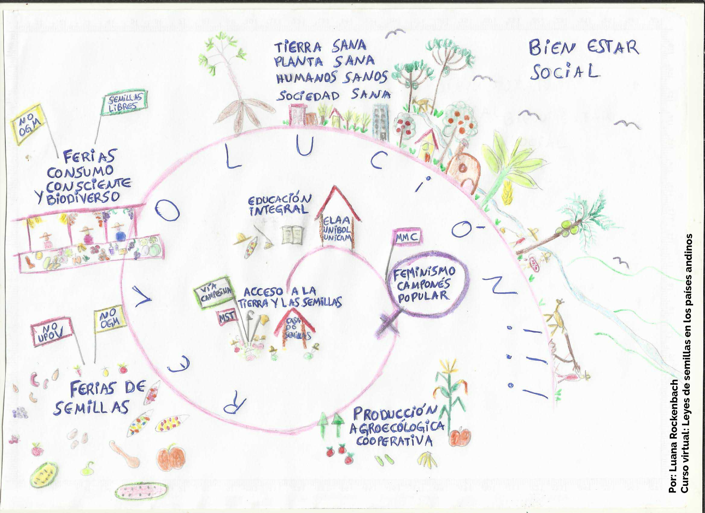 En el mapa se muestra cómo fortalecer al campesino con un consumo consciente de parte del público urbano, cooperativas y sistemas de participación de garantía que le permita seguir produciendo con biodiversidad. Es muy importante que las personas en la ciudad estén conscientes de la marginación que sufre las semillas y el campesino para que se sumen a la lucha por derechos y contra el monopolio sobre las semillas.” (Luana Rockenbach).