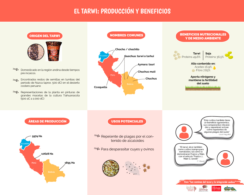 La infografía de Conclusiones: ¿De qué se habló en este foro? Recupera voces que remarcan que “(...) tenemos la suerte de poder cultivar el tarwi en un ecosistema andino de altura y tenemos su germoplasma diversificado”, menciona Jean Joseph Le Bour del Perú. Así, también en la Memoria del foro Lourdes Cuadro del Ecuador afirmaba: