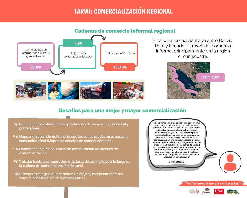La tercera infografía titulada Tarwi: Comercialización regional plantea la necesidad de generar mercados más articulados e integrales en la región considerando que de manera informal se comercialización de 90 a 100 tn/año de Bolivia hacia el Perú. En cambio, del Perú al Ecuador se exportan 2151 tn/año de tarwi o chocho. Sin embargo, el Ecuador tiene un déficit de producción de 6000 tn/año de esta legumbre.